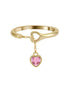 AMORETTE Ring is a delicate and charming statement of affection. It features a sleek open band adorned with a single dangling heart pendant, set with a brilliant pink 5A Cubic Zirconia stone. This gold-plated ring is crafted with an adjustable fit for personalized comfort and a playful, feminine style.